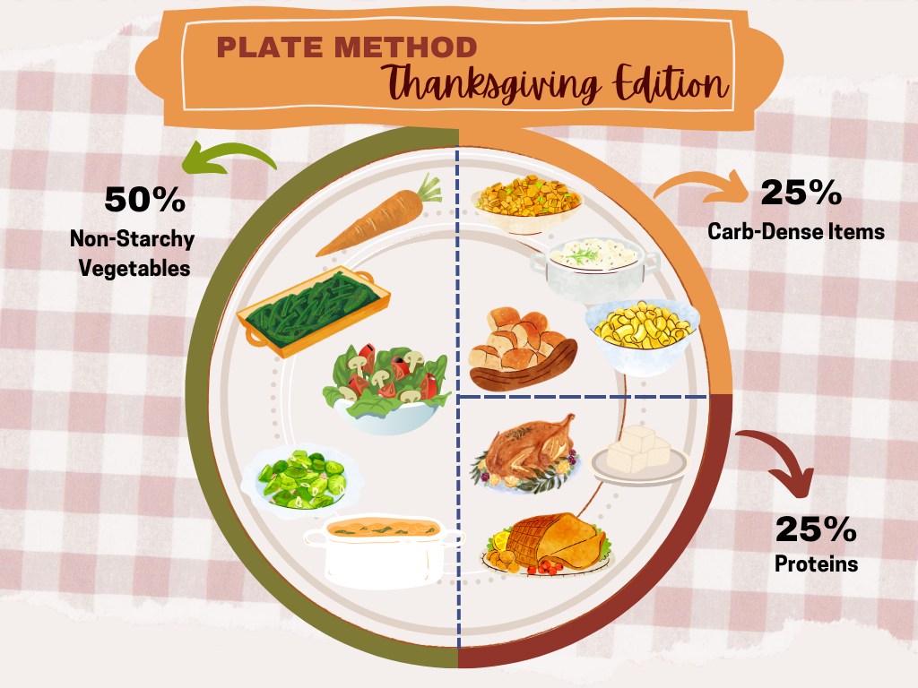 The holidays can be tricky, but the Plate Method makes it easy to enjoy your favorite foods without guilt or stress. Here’s how a balanced Thanksgiving plate might look:
